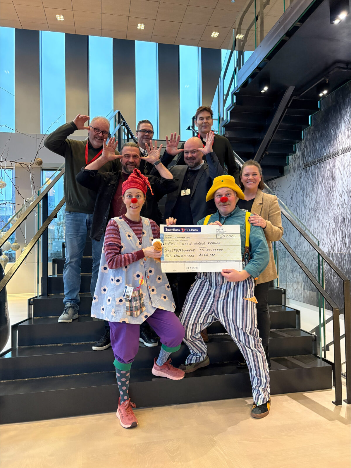 På sitt siste møte på Fornebu i 2025, overrakte LO i Aker ASA en gave på 50.000,- til Sykehusklovnene.